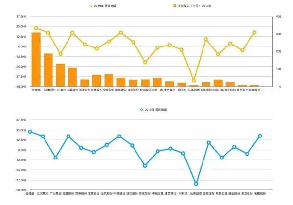 近日,隨著最后一家A股建筑裝飾企業洪濤股份的年報浮出水面,A股建筑裝飾企業2019年年報全部公布完畢,業績增速整體放緩、行業集中度不斷提升的發展態勢一目了然。在本研究報告統計的19家典型樣本A股建筑裝飾企業中,有的深耕主業,在2019年實現業績平穩增長,有的則出現業績大幅下滑,甚至出現大額虧損。其中,弘高創意虧損3.41億元,同比下降4610.10%。營收和歸屬于上市公司股東凈利潤(以下簡稱“凈利潤”)雙增長的只有6家,分別為金螳螂、亞廈股份、中裝建設、瑞和股份、亞泰國際、維業股份。
