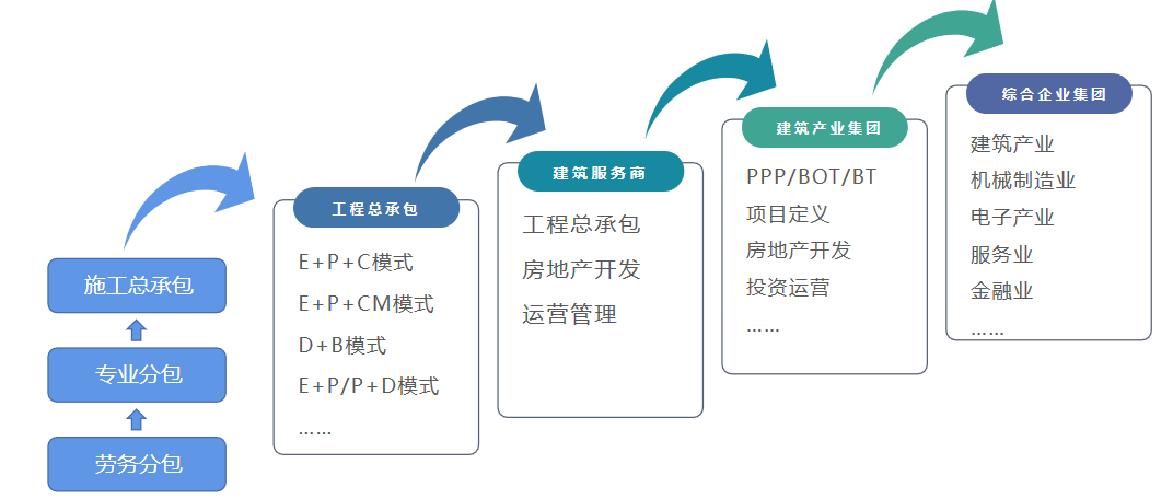 根據政策引導和行業發展趨勢來看,未來的建筑施工企業的成長路徑是專業承包向工程總承包發展,工程總承包向建筑服務商方向發展的趨勢。