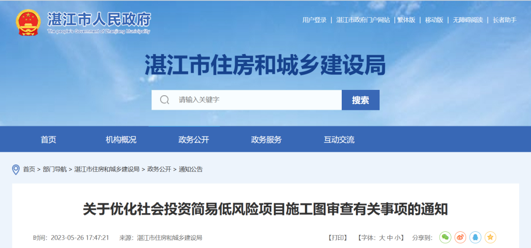 根據《2022年湛江市優化營商環境行動方案》有關營商環境改革任務要求,現就進一步優化我市社會投資簡易低風險項目(房屋市政工程)施工圖審查有關事項通知如下: